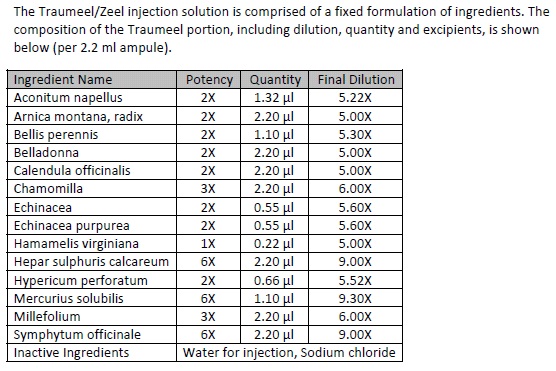 | Traumeel injection solution, unlike NSAIDs and corticosteroids, is thought to enter the inflammation cascade well before the prostaglandin synthesis begins, thus modulating the inflammation as well as the pain associated with arthritis and other relevant conditions. The protective action of the prostaglandin synthesis remains intact and the healing and repair in joints continues. Zeel injection solution’s multi‐targeted mechanism of action is not fully understood. It is thought that it addresses chronic inflammation, prevention of vascularization of the cartilage and endochondrium, remodeling and protection of cartilage, and alteration to cartilage mechanics. It has an excellent safety profile with very few reported adverse effects, few contraindications and no known drug interactions which makes it suitable for acute and longerterm treatment. It can be safely combined with other treatments but is effective as a monotherapy as well. Traumeel and Zeel injection solutions in combination are indicated for the treatment of inflammatory and degenerative conditions of the musculoskeletal system, such as arthrosis/osteoarthritis and/or rheumatic joint diseases, and for the relief of symptoms including pain, swelling, and joint stiffness. |