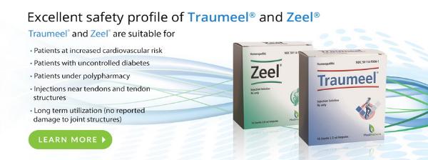 | Traumeel injection solution, unlike NSAIDs and corticosteroids, is thought to enter the inflammation cascade well before the prostaglandin synthesis begins, thus modulating the inflammation as well as the pain associated with arthritis and other relevant conditions. The protective action of the prostaglandin synthesis remains intact and the healing and repair in joints continues. Zeel injection solution’s multi‐targeted mechanism of action is not fully understood. It is thought that it addresses chronic inflammation, prevention of vascularization of the cartilage and endochondrium, remodeling and protection of cartilage, and alteration to cartilage mechanics. It has an excellent safety profile with very few reported adverse effects, few contraindications and no known drug interactions which makes it suitable for acute and longerterm treatment. It can be safely combined with other treatments but is effective as a monotherapy as well. Traumeel and Zeel injection solutions in combination are indicated for the treatment of inflammatory and degenerative conditions of the musculoskeletal system, such as arthrosis/osteoarthritis and/or rheumatic joint diseases, and for the relief of symptoms including pain, swelling, and joint stiffness. |